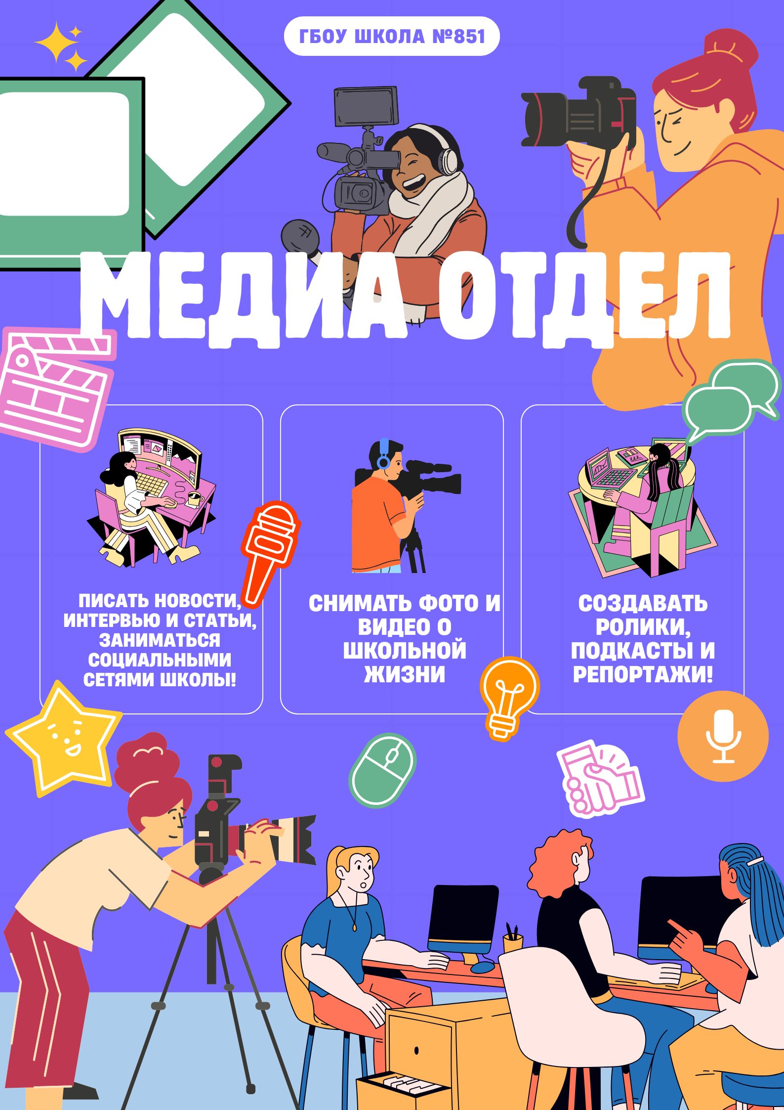 Если тебе интересно рассказывать о событиях, брать интервью, монтировать видео или просто делиться школьными новостями — добро пожаловать в нашу медиакоманду!